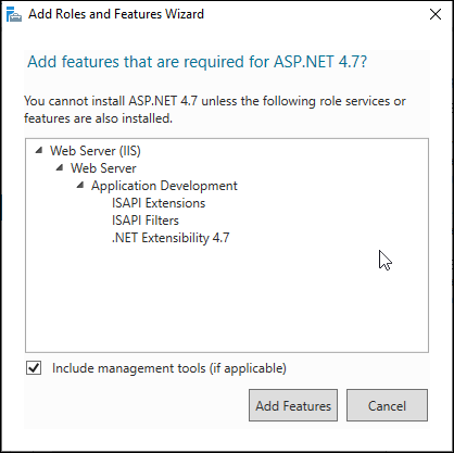 c. This opens a dialog box asking you to confirm adding additional features that must be installed for ASP .Net 4.6 or ASP .Net 4.7.