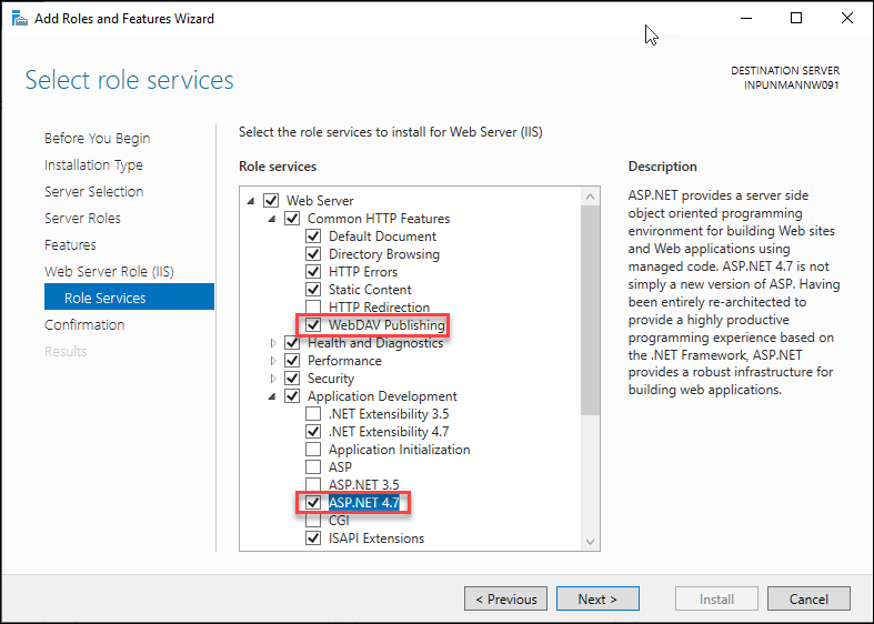 - Expand Internet Information Services > World Wide Web Services > Application Development Features, and select the ASP.NET 4.7 check box (this automatically checks other relevant boxes). For Windows 10 version 2004, select the ASP.NET 4.8 check box.