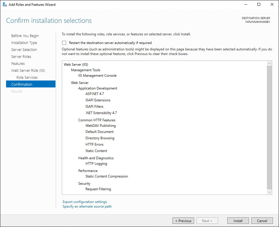 - The features are installed and IIS is configured.