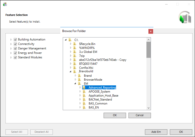 - Browse and select an individual [EM Name] folder to install/update. This folder must be available in the valid folder structure ....\EM\[EM Name]. Ensure that the parent extension of the newly selected extension is also selected. Otherwise, the newly selected extension (child) cannot be added and a warning displays.