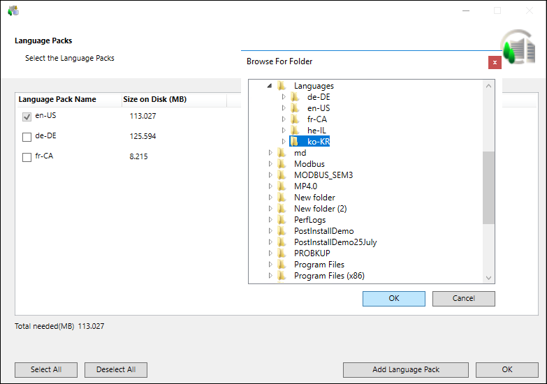 NOTE 1: To add a language pack, the language pack must be available in the Languages folder. Alternatively, you can select the Languages folder itself, which in turn lists and selects by default all the language packs included in the Languages folder.