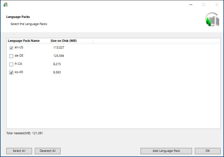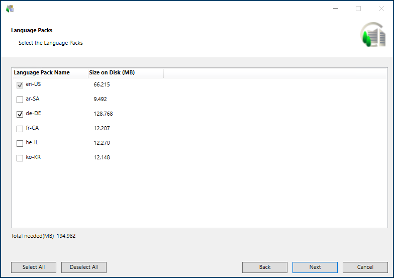 NOTE 2: The Installer calculates and displays the disk space (in MB) required for each selected language pack, as well as the total disk space required for all selected language packs. The total disk space for all selected language packs is added to the total disk space for the installation directory.