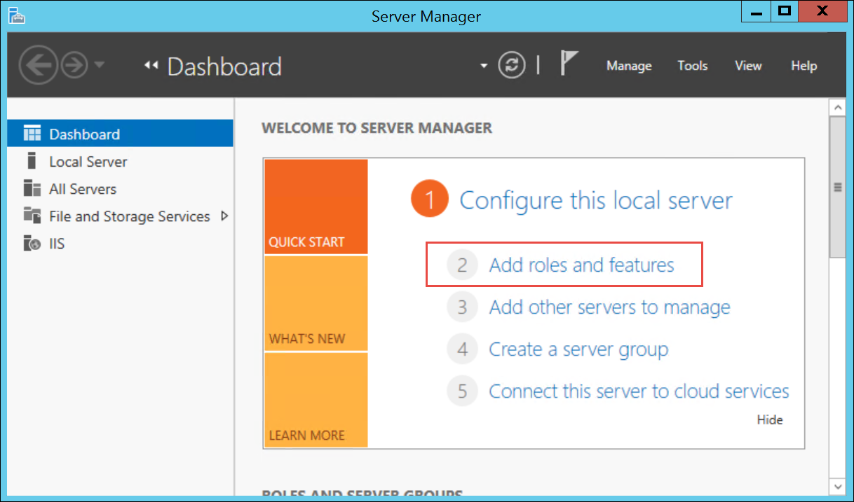 - On the Manage menu, click Add Roles and Features.