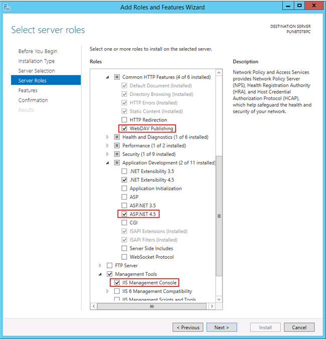 a. Expand Web Server IIS > Web Server > Common HTTP Features, and select WebDAV Publishing.
