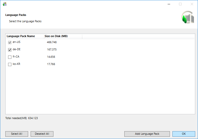 - All the language packs available in the Languages folder located at the path …\InstallFiles on the distribution media are listed.