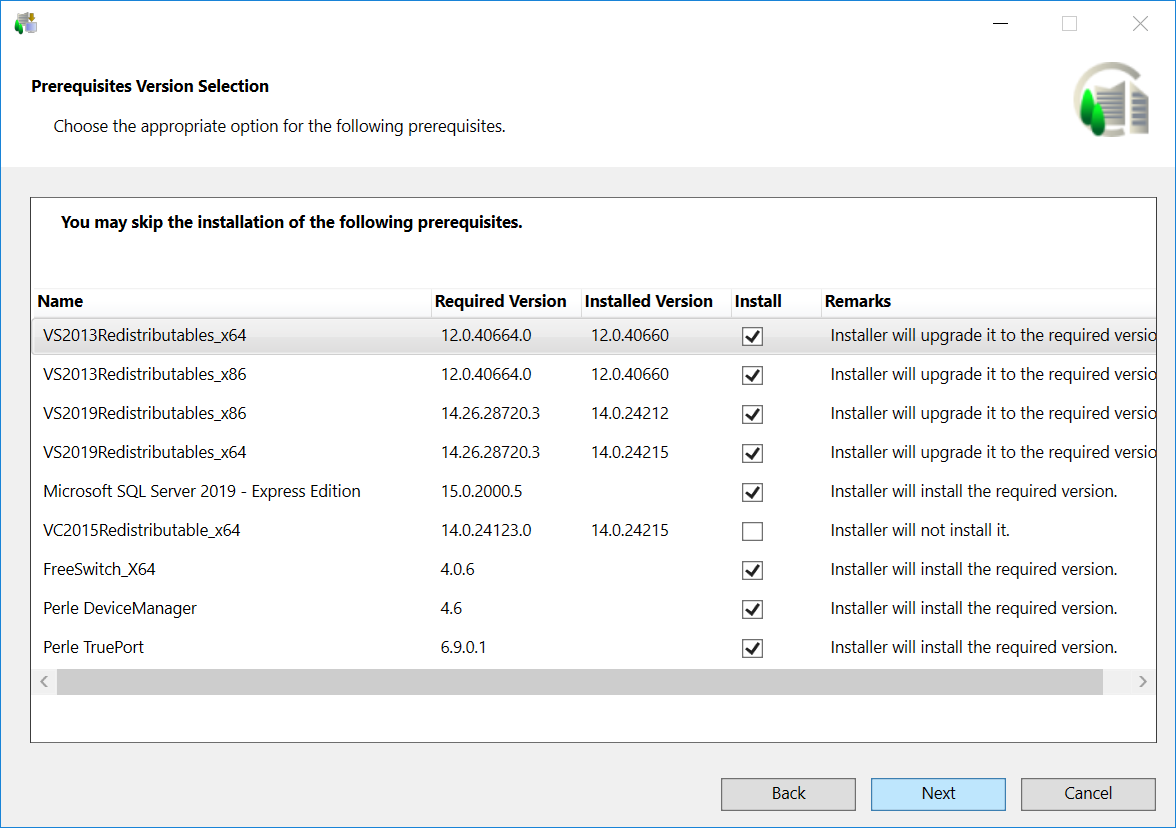 - The Prerequisites Version Selection dialog box displays listing the required versions of the installed prerequisites.
