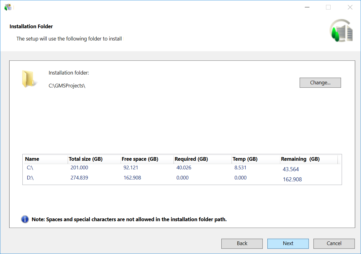 NOTE 3: The installation folder will inherit the ACL rights (Access Control List) from the installation drive. For example, if C is the installation drive the folder C:\GMSProjects will inherit the ACL rights from C drive. These rights define permissions given to users related to operations for working with the folder. For more information, refer to the Cybersecurity Guidelines for securing this.