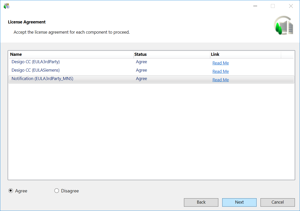 - In the License Agreement dialog box, accept the terms of the license agreement by selecting Agree for each license that you want to install and then click Next.