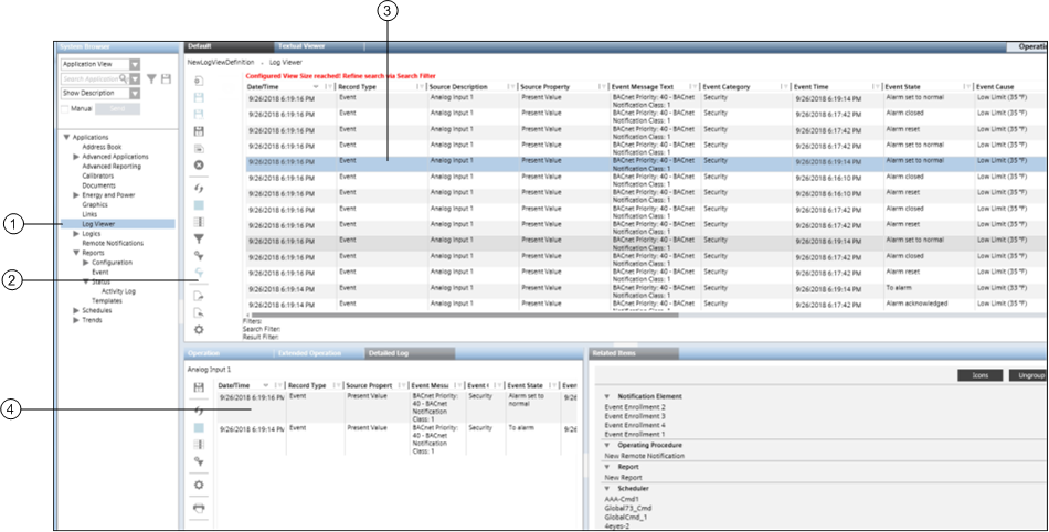 1 | System Browser | Displays all the saved Log View definitions in Application View > Applications > Log Viewer. |