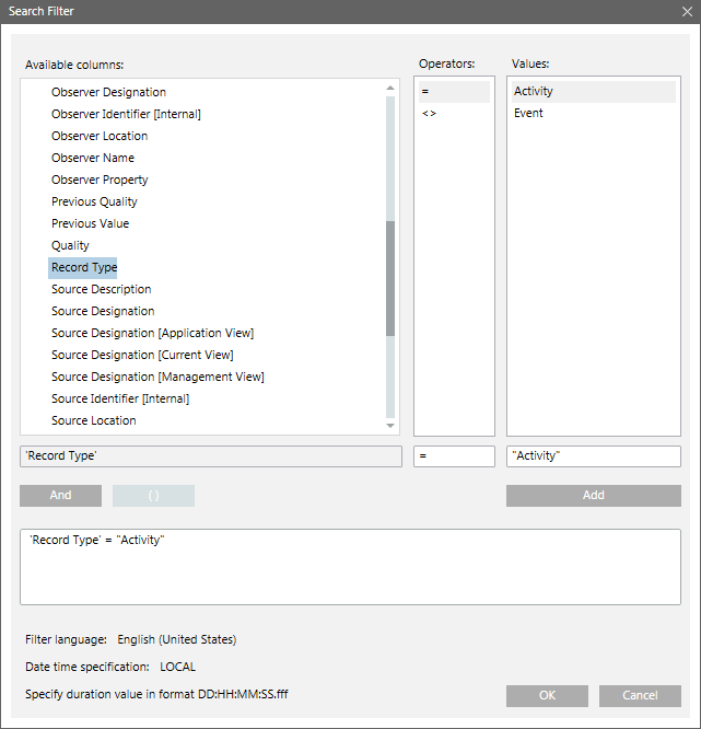 The Custom Filter dialog box allows you to define result and search filter expressions on a particular column. You can access this dialog box by either: