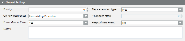 - Link existing procedure and reset steps: The currently executing instance of the procedure will be used to handle the recurring event, but any steps already executed will be reset. This means that the operator will have to start the procedure from the beginning. With this option you can also set a time interval (default: 300 seconds) that must elapse between two successive recurring events. If a recurring event happens after that time, the procedure steps will be reset.