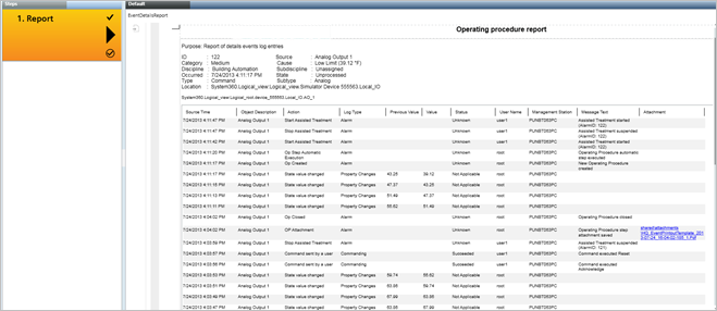 You are in the Assisted Treatment window, and the operating procedure includes a reportstep that you must manually execute. For background information about the Desigo CC reporting feature, see the reference section.