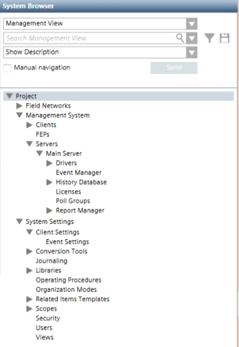 The Management View is predefined and includes all the objects pertaining to its overall management such as: representation of the field site, the computer networking, and other site project settings. Basically, it provides a depiction centered on the site installation and allows navigation through the hierarchical structure of the project tree. Authorized technicians typically use this view to set up the site project.