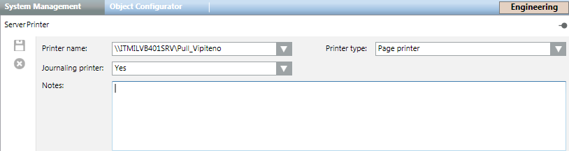 In Engineering mode, when you select a server printer object in System Browser, the System Management tab toolbar is available. This allows you to save and delete printers.