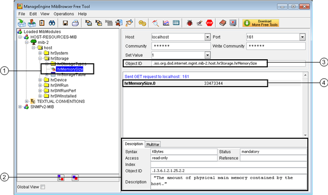 4 | The result of the GET command sent from the ManageEngine MIB browser displays in this area. This is only possible when the MIB browser communicates with the SNMP device thus reading real-time SNMP values. It may be useful for verifying the configuration and the values read from Desigo CC. The SNMP object contains “.0” (dot zero). This is the only section of the ManageEngine MIB browser where the last digit to use for reading the whole SNMP OID appears. |