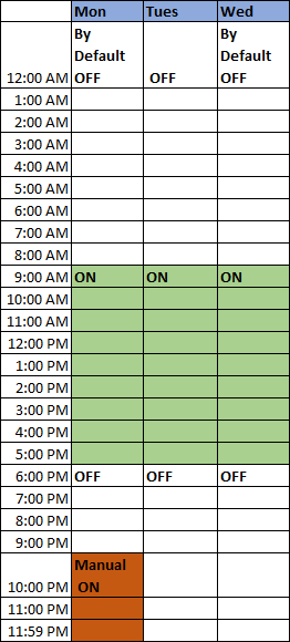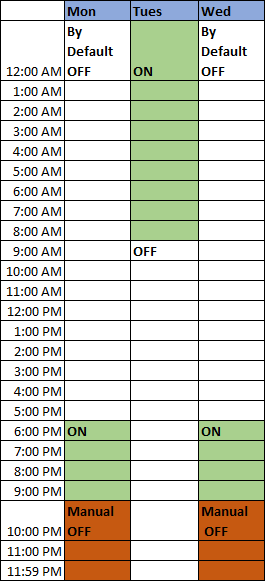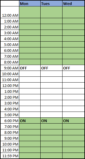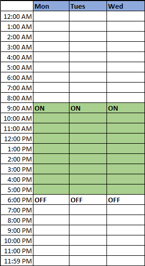 For example, the daily schedule for Monday, will be functional from 12.00 AM to 11.59 PM.