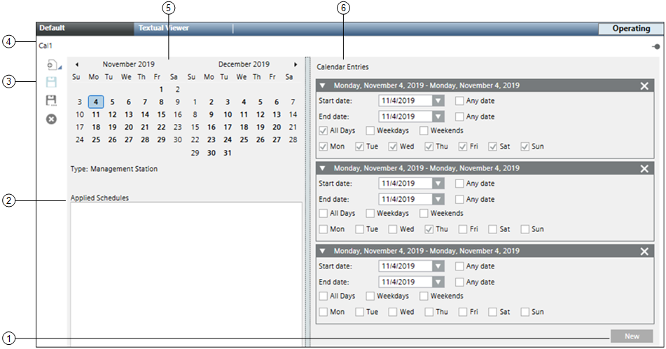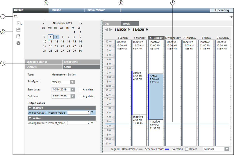 3 | Tabs | Displays four tabs: Schedule Entries, Outputs, Exceptions, and Setup. Schedule Entries: Displays a list of entries for the selected date and Output values. The Output values indicate the ON and OFF values for Daily schedules only. For weekly schedules the Output values are present in the Setup tab. Outputs: Outputs are objects associated with the schedule. You can drag objects to any tab to add them to the schedule. Dropping them on a tab other than the Outputs tab makes the Outputs tab active. Selecting an object in this section sends data about the object to the Operation/Extended Operation tabs, where you can view additional information about the object and make changes to it. Double-clicking an output makes it the new primary selection. Exceptions: Displays a list of exceptions for the selected date and allows you to set the exception period, including a recurrence pattern. For calendar exceptions, you can choose a calendar object from a drop-down list. This tab also displays schedule entries and ON and OFF values. Adding an exception makes the Exceptions tab active. You can create an exception by right-clicking the schedule or by clicking the New button in the Exceptions tab. Setup: Allows you to specify the type of schedule (Weekly or Daily) that you want to create. You can specify the type of schedule by selecting either Weekly or Daily from the Sub-Type drop down list. You can also specify the start date and end date for the schedule from the Setup tab. The Any date check box next to the Start date defaults to the current date, whereas the Any date check box next to End date, defaults to an infinite date. |