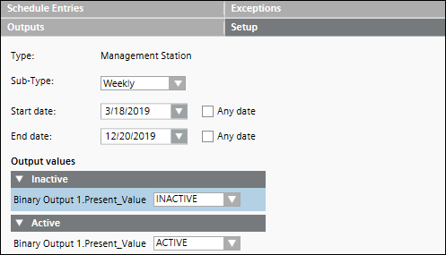 Management station schedules have only one binary output (value active or inactive). You can assign several objects to that output.