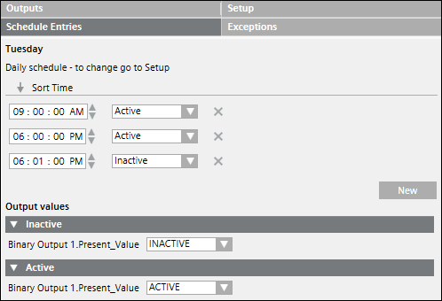 In this example, the Inactive status of the schedule set at 6 p.m. continues till 9 a.m. the next day. There is no change of value at midnight.
