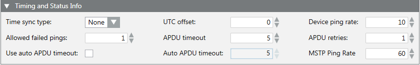 The Timing and Status Info expander allows you to configure the BACnet device timing and communication settings. Events received from the subsystem and displayed on the management station are time-stamped by the subsystem. To avoid inconsistencies, the clock of the subsystem must be aligned with the clock on the management stations.
