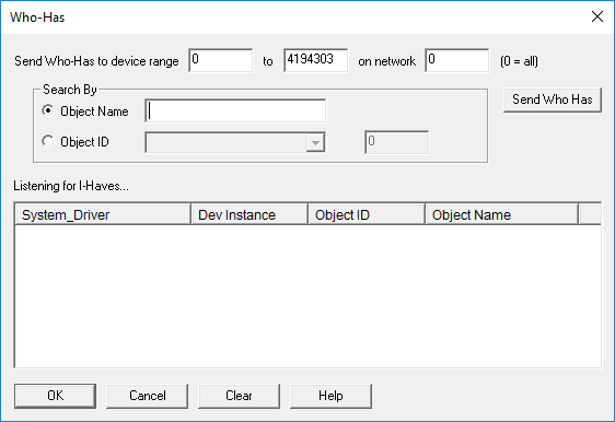Send Who Has | Select this button once you have entered either the Object Name or the Object ID and Instance Number. |