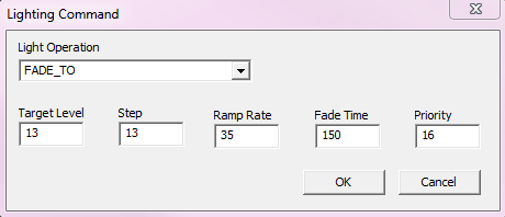 The Lighting Command dialog box allows you to provide additional lighting functionality with special lighting-specific functions, such as ramping, stepping, and fading.