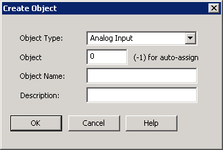 From the system tree, select your BACnet device, and then from the Services menu, select Create Object.