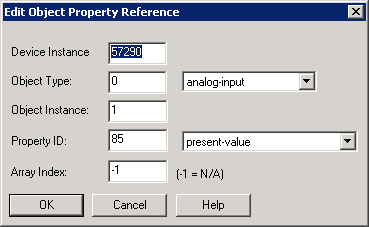 From the system tree, select your BACnet device. From the Channel Objects folder, select an object. In the Property Name column, double-click present-value.