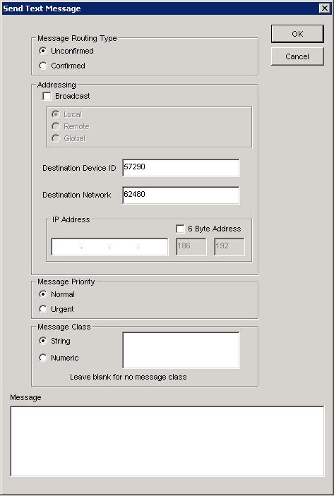 Broadcast | Click this check box to broadcast the text message to the local subnet, a remote subnet, or globally. |