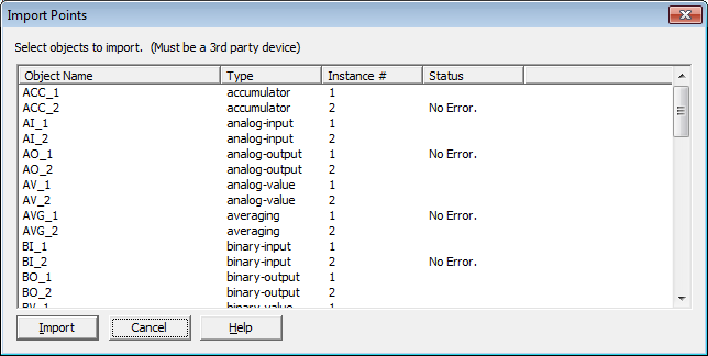 The Import Points dialog box allows you to selectively import objects (points) from any BACnet devices into the Desigo CC database.