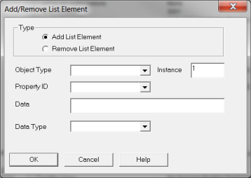 The Add/Remove List Element dialog box allows you to add list elements to an object in a device or remove list elements from an object in a device. The BACnet Object Browser only allows editing of simple data type lists.
