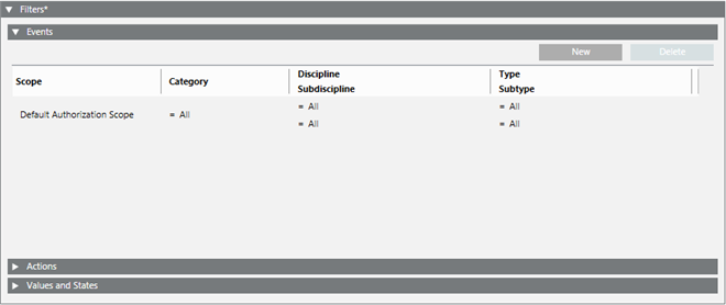 In Engineering mode, when you select a journaling definition in System Browser, the Journaling Configurator tab lets you configure the journaling definition by allowing you to select a journaling printer from the Printer drop-down list. It also lets you set items to be included in the printout using one or more filters (Events, Actions, Values and States).