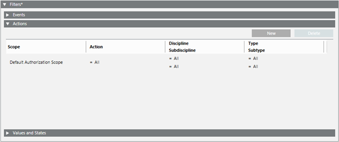 Each actions filter occupies one row. An action must meet all the criteria on its row to be printed out. There is an OR logic between rows.