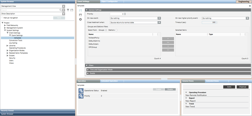 In Engineering mode, when you select the main Event Settings folder or a rule under it, the Event Settings tab displays.