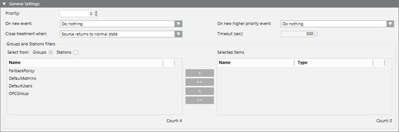 - Select the Groups or Stations radio button to display a list of the corresponding items on the left. Then move items to the Selected Items list or vice versa by double-clicking them, or by using the arrow buttons.