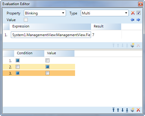 Condition | Display a range or threshold, when met by the expression result, applies the associated Value to the property evaluation. Multiple conditions are supported. |