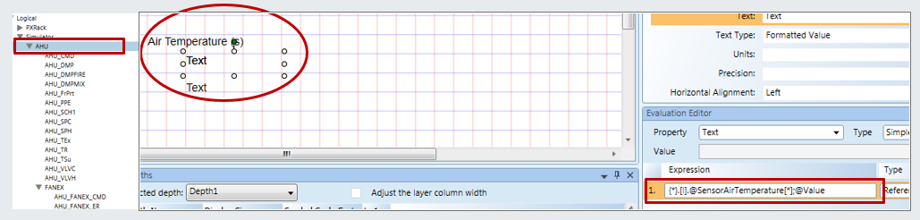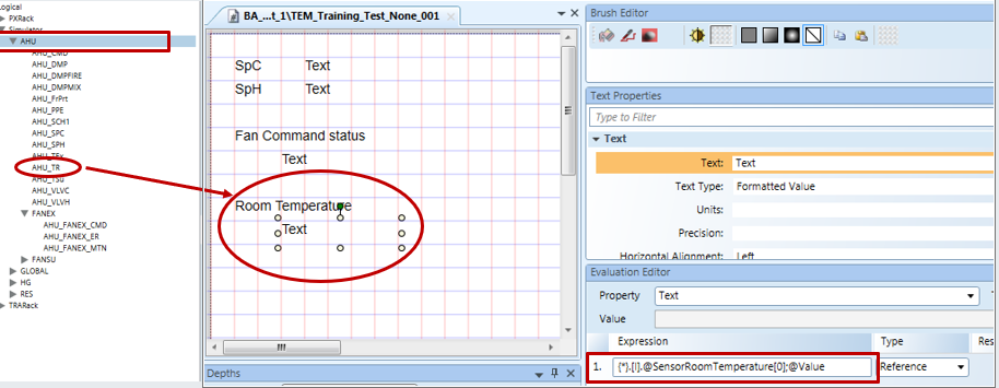 For Example: When the graphic template is called from the AHU node, it should display the property Value from the first data point below AHU that has the function Sensor room temperature assigned to it. {*}.[l].@SensorRoomTemperature[0];@Value Result - The template displays the present value for the AHU_TR node. The [0] resolves a single value according to the index. |