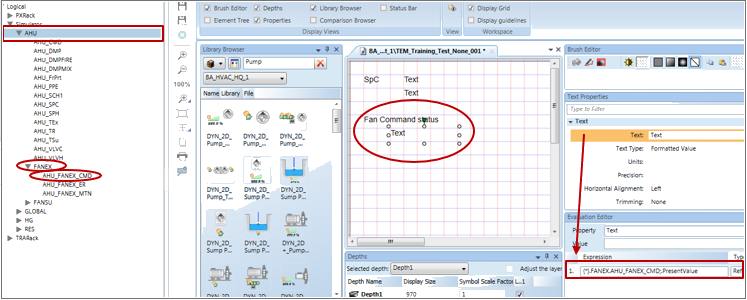For Example: In System Browser, if you click an AHU node the graphic template in the function assigned to AHU displays. The template is configured, in part, with the expression: {*}.FANEX.AHU_FANEX_CMD;.Present_Value The template displays the resolved CMD status of the object, which is the child node of FANEX” |