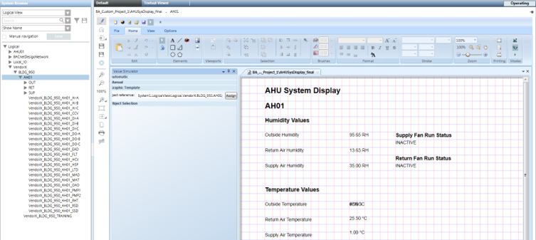 The Value Simulator is used to test the correctness of the substitutions as you build the graphic template. Each time a change is made to the template, you can drag the parent data point instance from System Browser to the Object Reference field and click ‘Assign’.