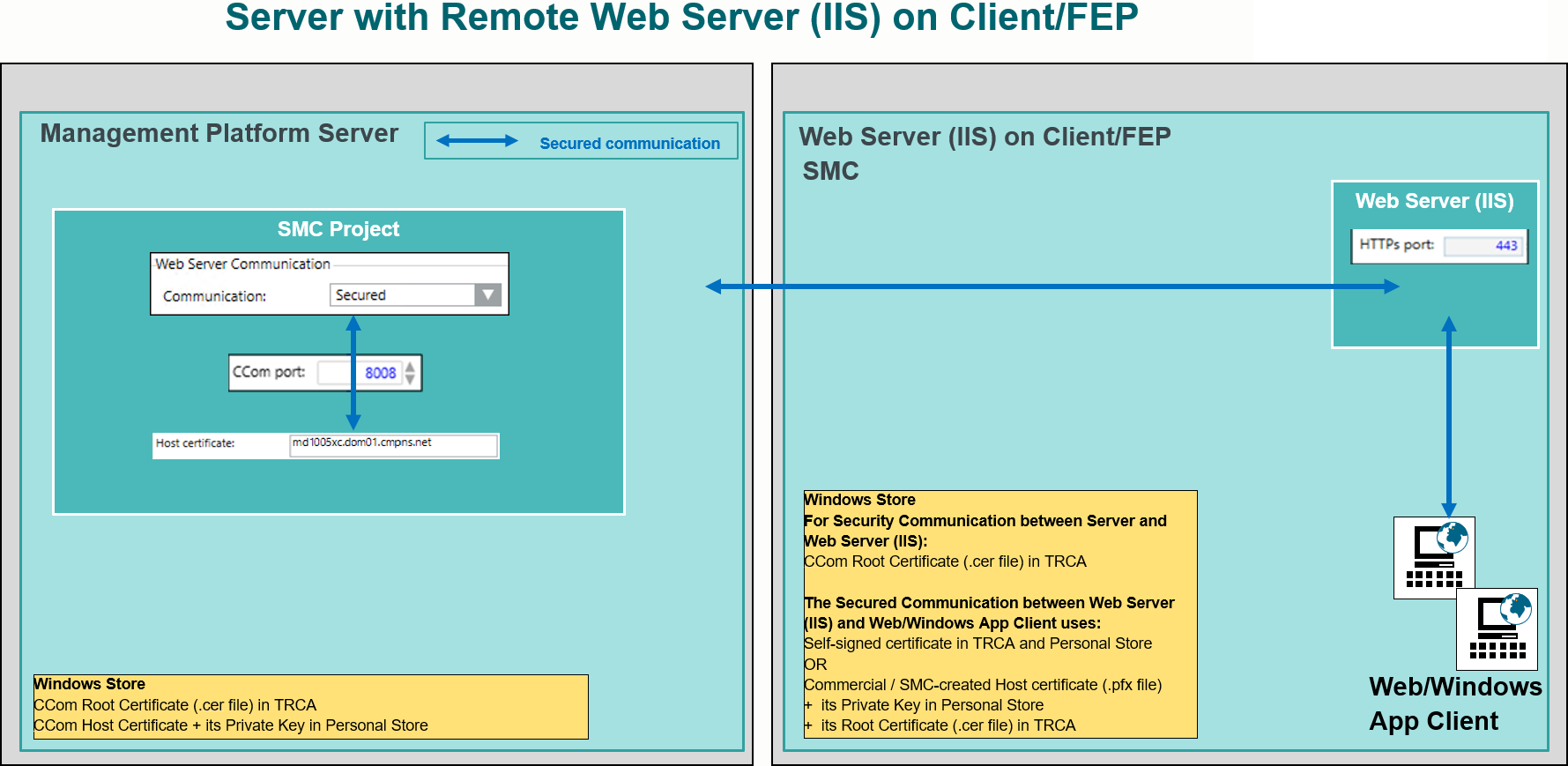 The communication between the Desigo CC Server and the local web server (IIS) can be left as a local communication (without certificates) as they both are hosted on the same stand-alone computer. The communication between the web server (IIS) and Web/Windows App clients is always secured (using the web application certificate).