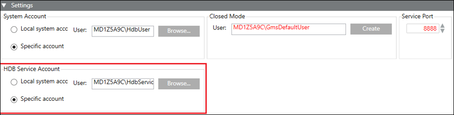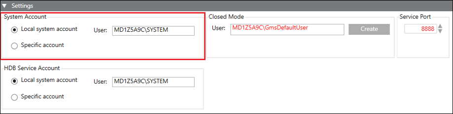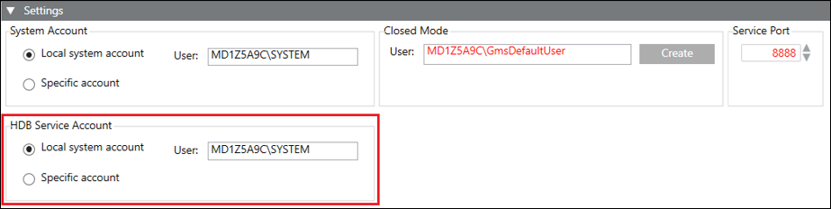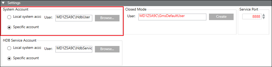 The Settings expander allows you to specify settings for System Accounts, HDB Service Account, Closed Mode and Service Port (only on Server).
