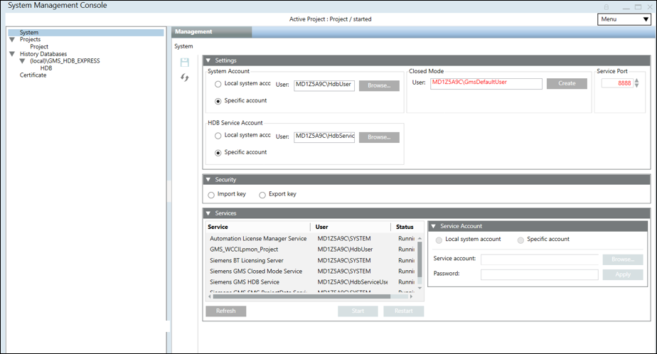 - The Siemens GMS HDB Service gets configured in Windows to start under this specific account. The changed user is set as the HDB service user.