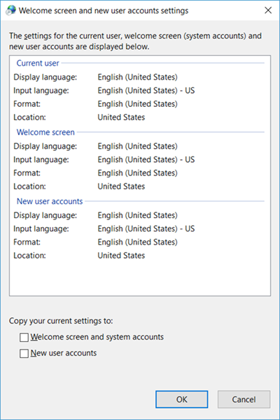 - If not, select the two checkboxes to copy the current settings to Welcome screen and system accounts and to New user accounts and click OK.