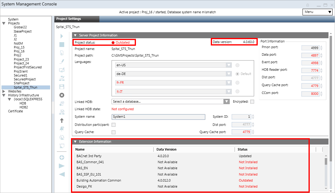 The Extension Information expander lists all the extensions that are configured in a project. This expander is not available on the Client/FEP.