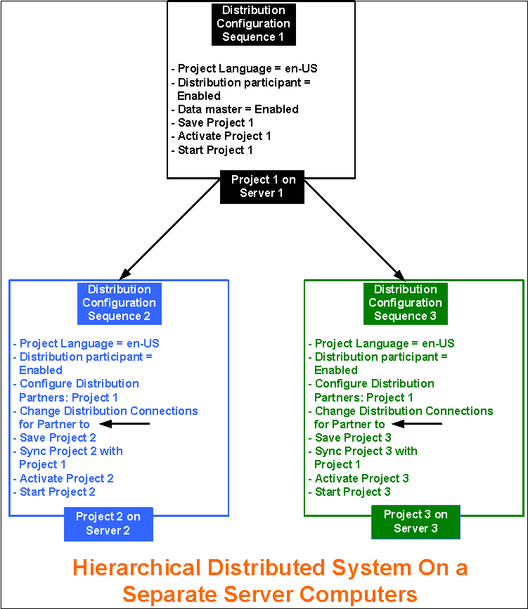 Stopped. For example, if you have three stopped projects, Project1, Project2, and Project3, you cannot set up an outdated project in distribution. You must first upgrade it to the current software version. - The EMs configured in one distribution partner project are installed on all the other systems (Servers) participating in distribution.