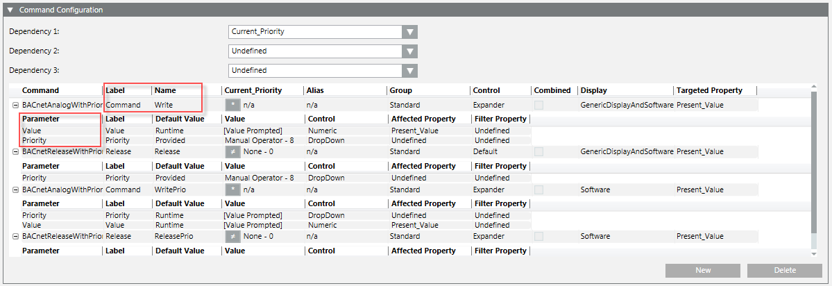 - Name – You will enter the information under this heading, or select it from the drop-down menu, in the Command Name field of the Configuration and Navigation properties. See table below.