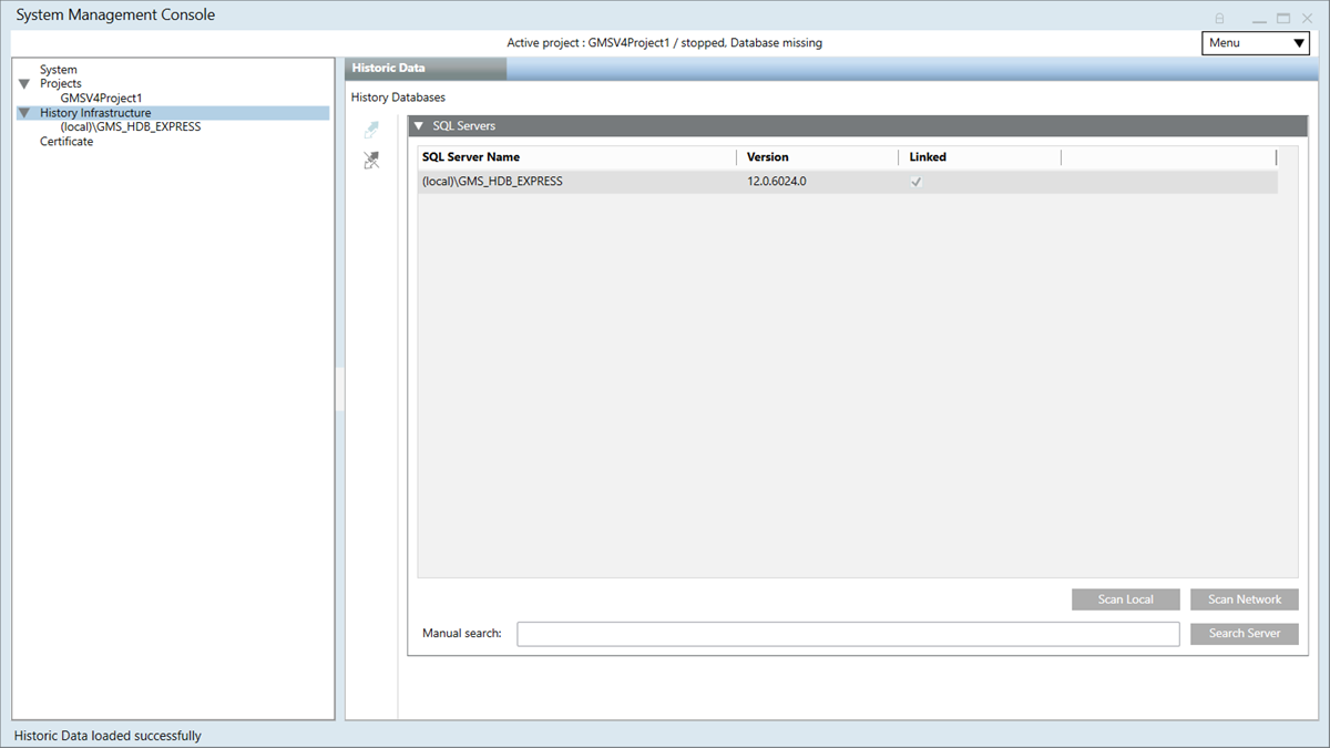 - The server is connected. The server does not yet contain a History Database if you connect for the first time.