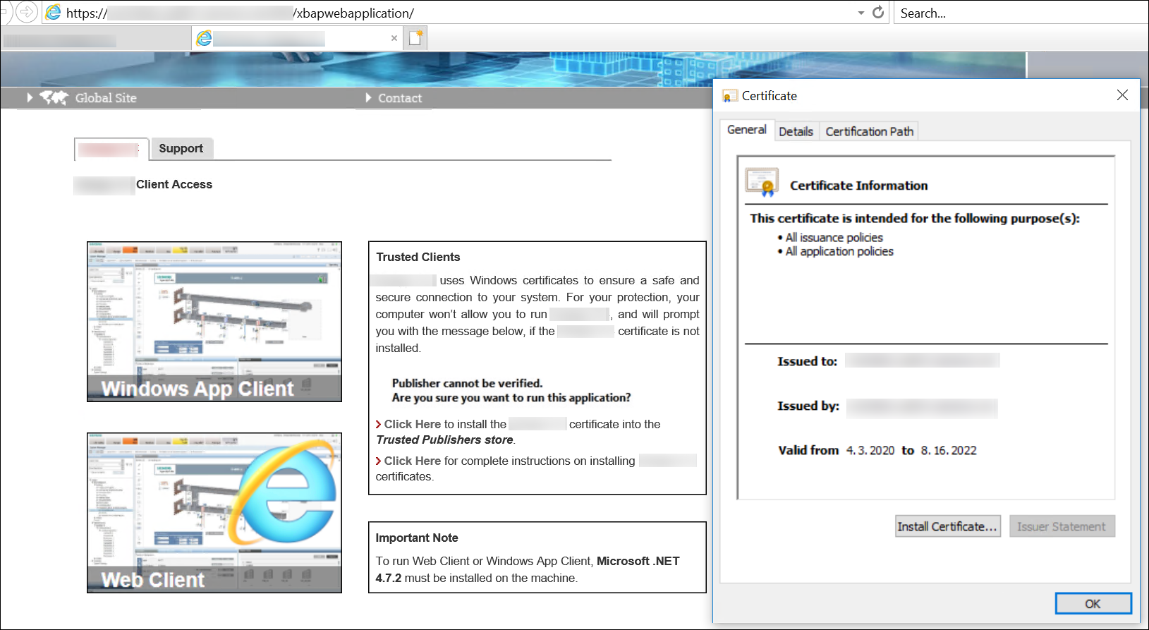 - Install the web application certificate for verifying the signature when downloading the application in the appropriate Windows certificate store.