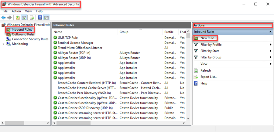 - In the Windows Defender Firewall with Advanced Security dialog box, click Inbound Rules.