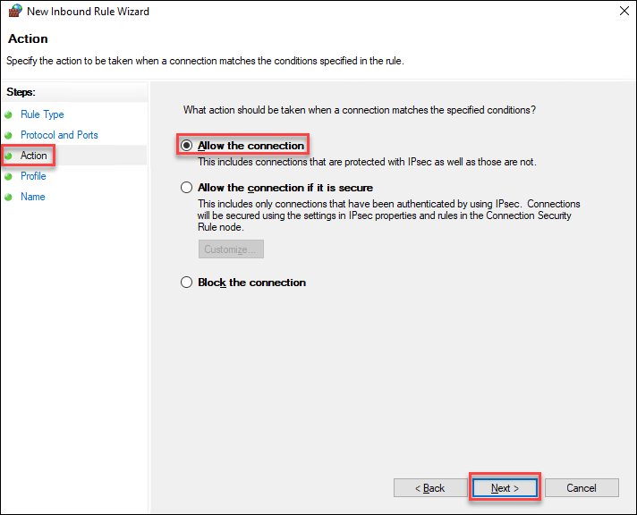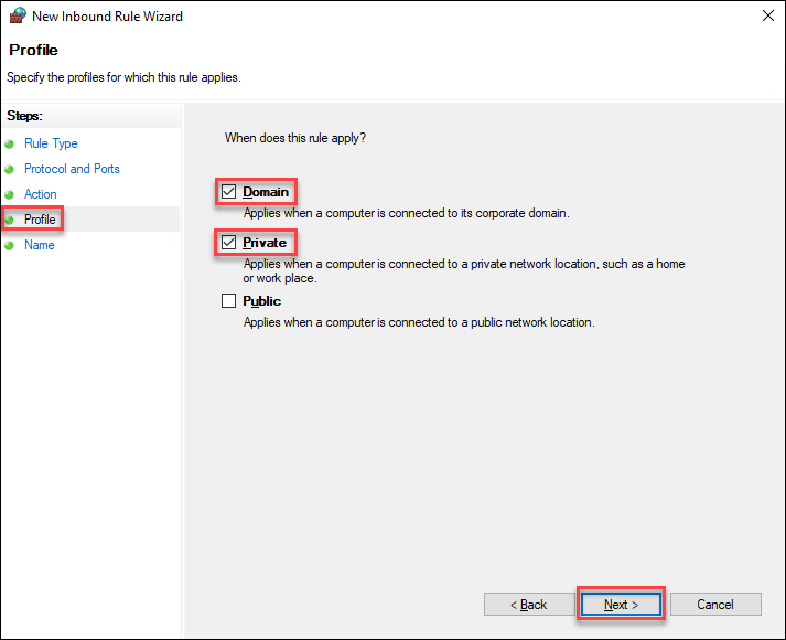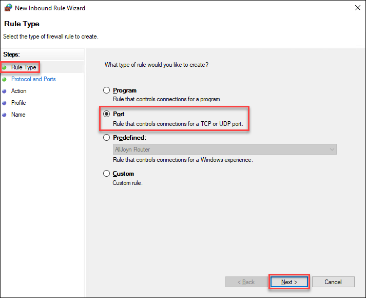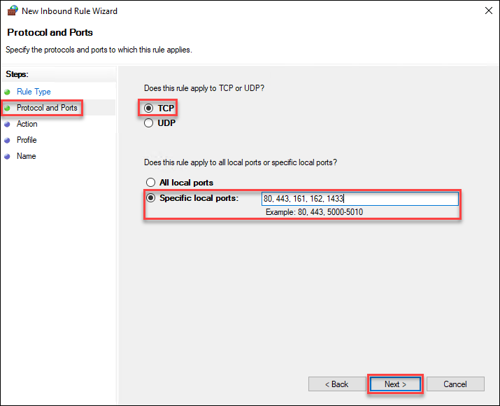 - In the Specific local ports field, type all the TCP ports required for the server, and then click Next.